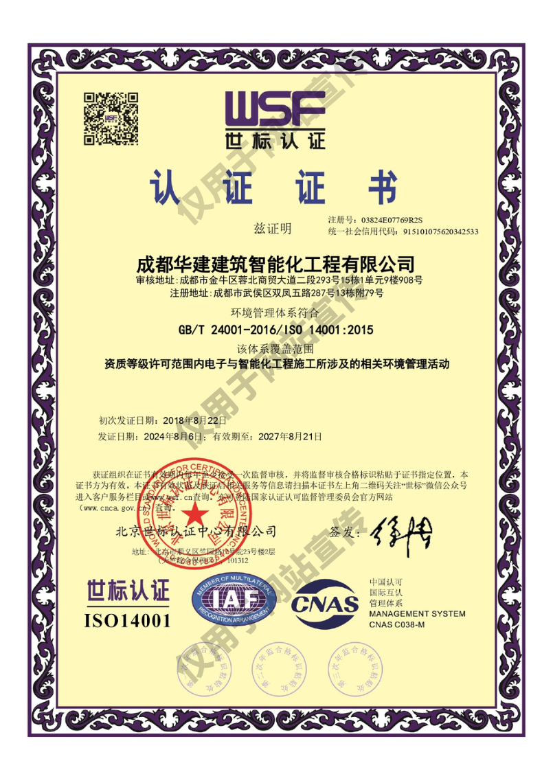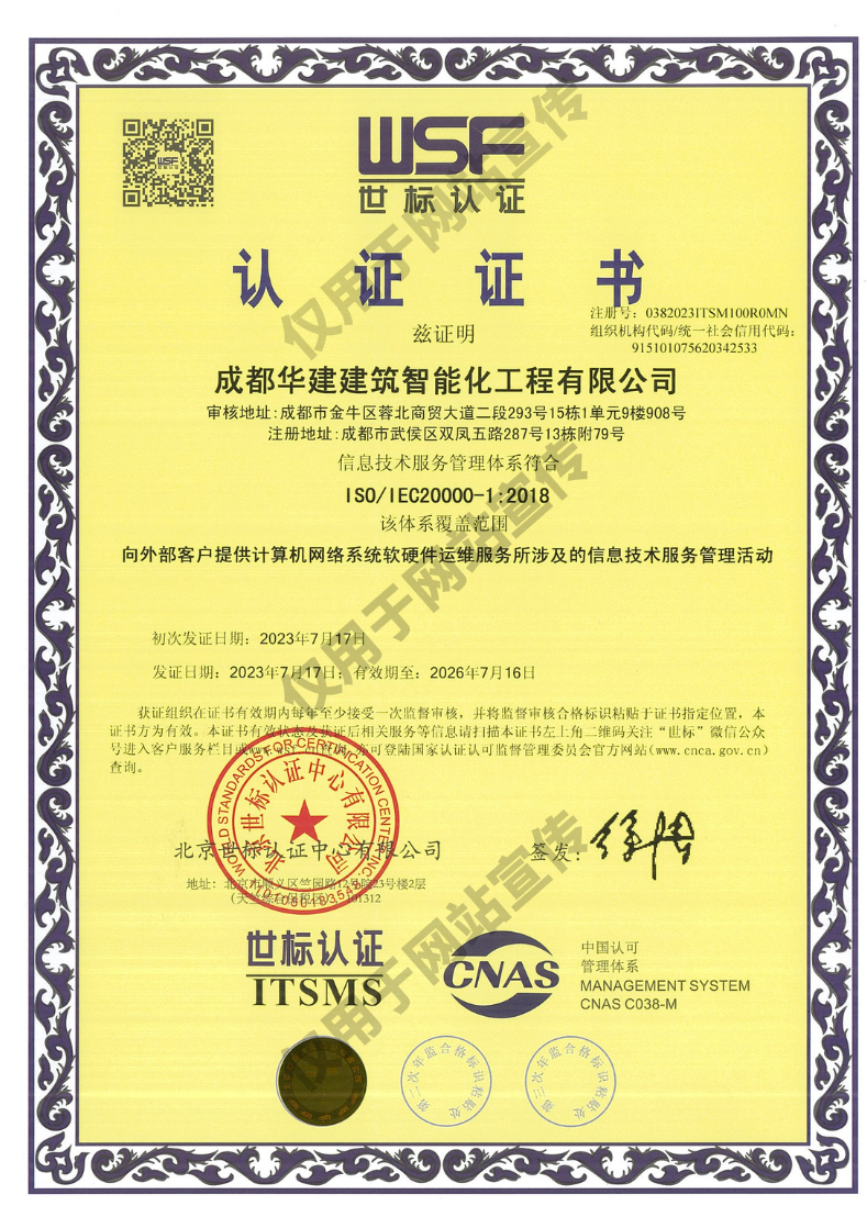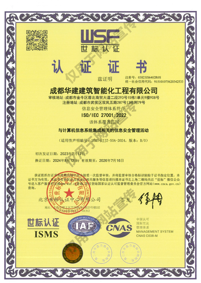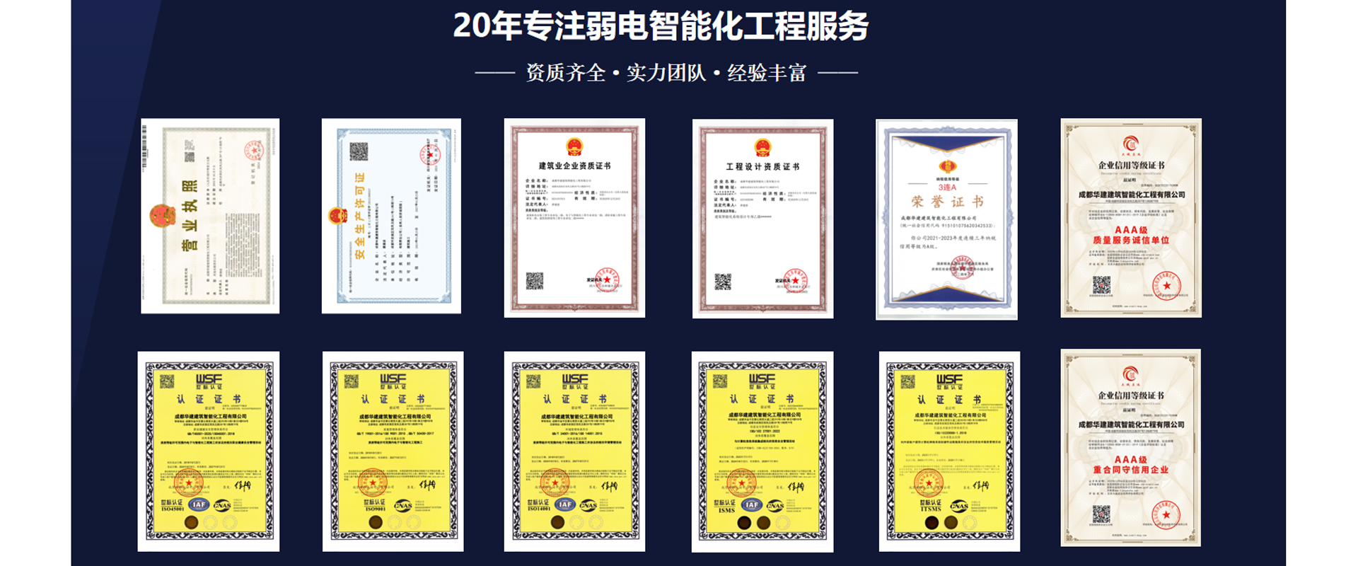 成都華建建筑智能化工程有限公司,19年專注弱電智能化工程、消防工程、建筑機(jī)電安裝工程的專業(yè)公司,具備電子與智能化工程、消防設(shè)施工程、建筑機(jī)電安裝、建筑裝修裝飾、建筑智能化設(shè)計(jì)等相關(guān)30余項(xiàng)資質(zhì)及證書。設(shè)計(jì)、施工和維保一站式服務(wù),多行業(yè)中大型成功交付案例。…
